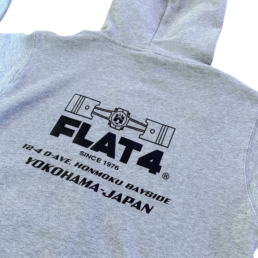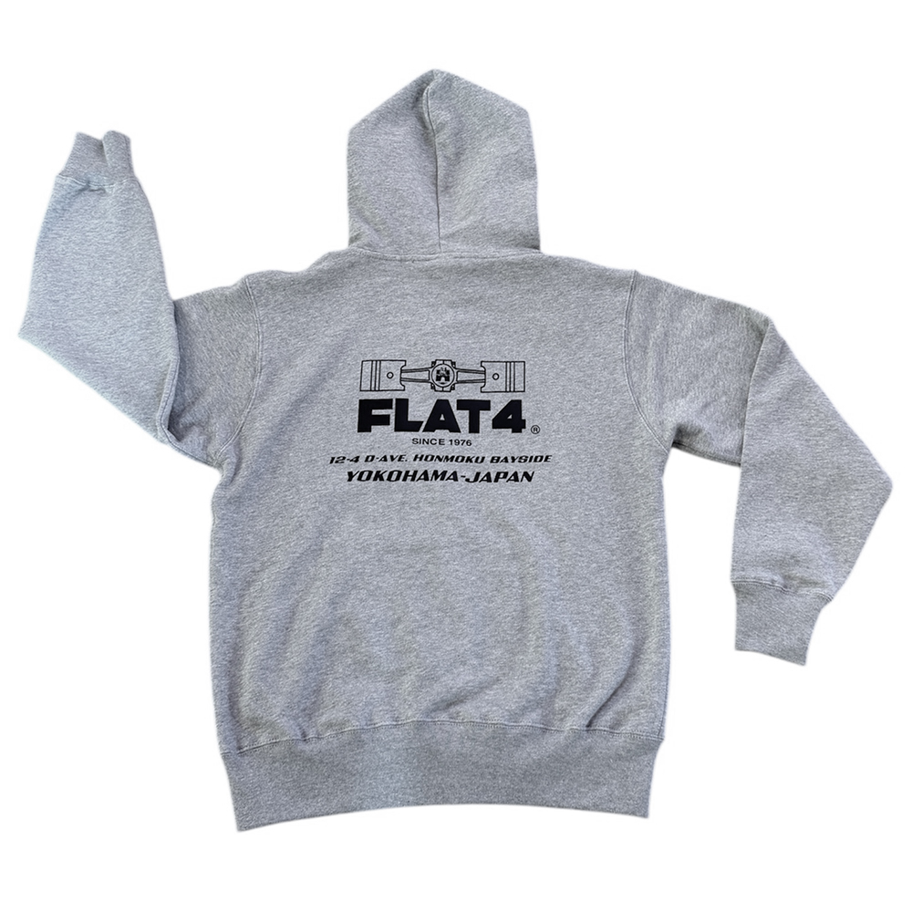 前面胸元にFLAT4オーバルロゴ、背面にFLAT4ピストンロゴ & YOKOHAMA-JAPANの文字がプリントされたシンプルなデザインで、アウター/インナー問わず様々なシーンで活躍し、存在感のある大きめの二重フードやカンガルーポケットなど、実用性に優れたダブルジップパーカーです。