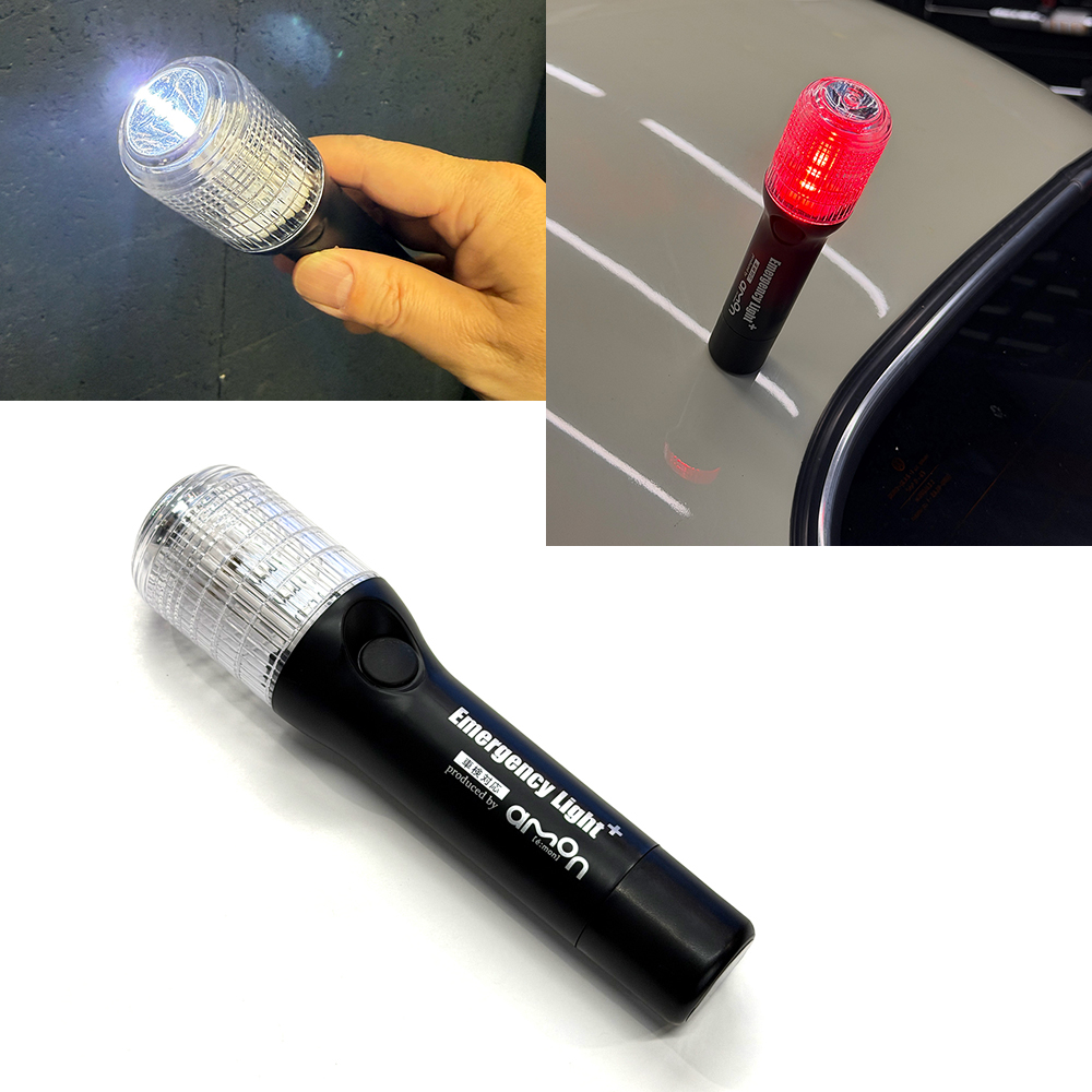 発煙筒の代わりに車載できる車検対応品で、有効期限がなく電池交換により繰り返し使用できます。赤色LEDが点滅し夜間200m先から危険を知らせる非常信号灯と懐中電灯をスイッチ1つで簡単切り替え可能で、連続使用は最大約8時間となります。発煙筒は車外に出て着火させ、車両より20~30m以上後方(高速道路では50m以上)に置かなければならず、トラブル発生時に冷静に行動するのも困難です。