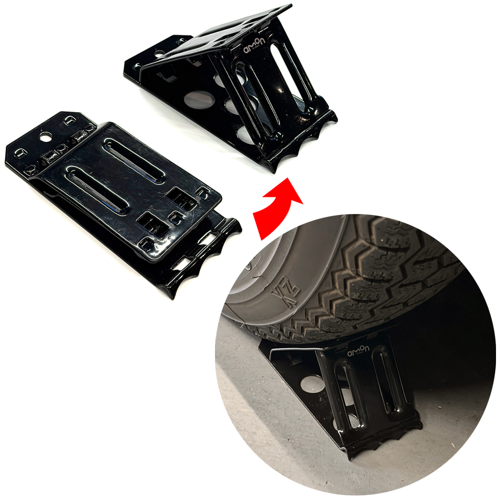 コンパクトな折りたたみ式で、坂道の駐車時や作業時の車輪止めにお使いいただけます。スティール製のパウダーコート仕上げとなります。