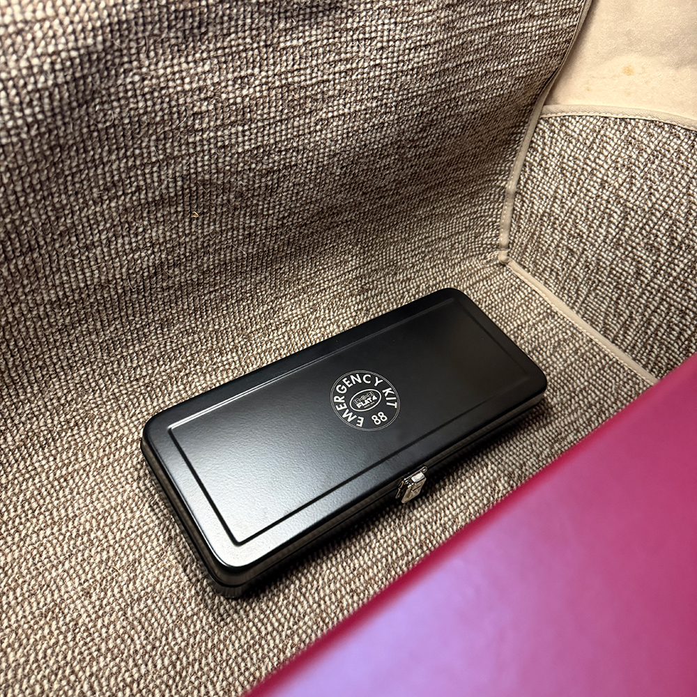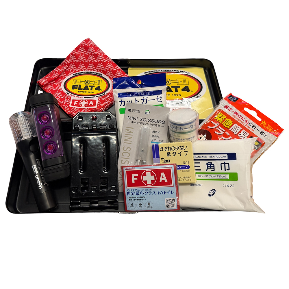 空冷VWのハザードスイッチノブをモチーフにしたFLAT4オリジナルエッチングロゴ入りのスティールボックスに、ライト付き非常信号灯/パープルセーバー/タイヤストッパー/FA (First Aid) KITが収められた、FLAT4だけのスペシャルSETとなります。