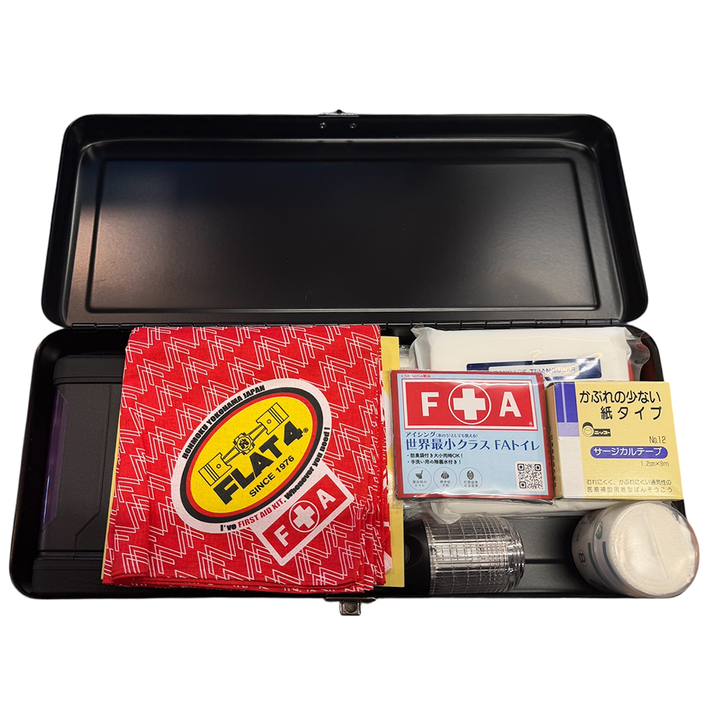 車両用救急SETとなるFA (First Aid) KITには外傷用の資材の他に簡易ブラケンケットや携帯型トイレも含まれている為、交通事故だけでなく災害等の有事の際にも役に立ちます。また、付属のFLAT4 x FAデカールを車両に貼る事によりFA KITの所在を示し、必要な人に迅速に応急処置を施す資材を提供する事が可能となります。