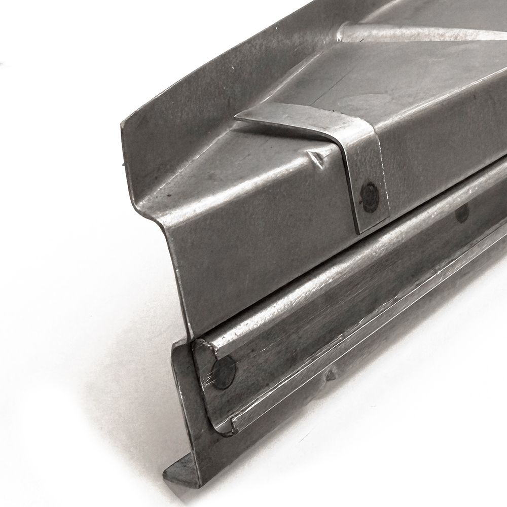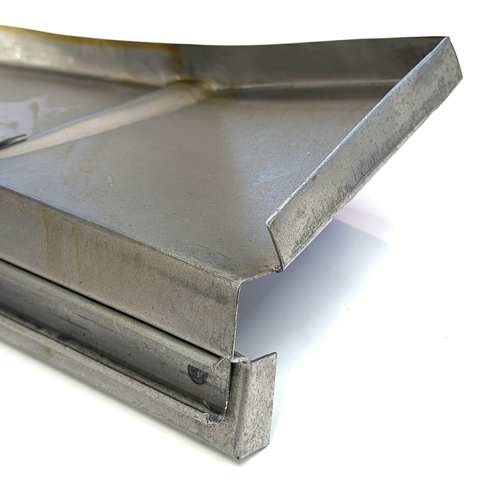 TYPE-1のエンジンルーム左右に位置するエンジンベイサイドトレイのリペアパネルは、ファイヤーウォール側の立ち上がりや2本のプレスライン、サウンドボードを固定するためのタブ、エンジンシールラバー用ガイドレール等、VW純正のディテールを忠実に再現して作られており、耐久性に優れた1mm厚のH/Dスティール製です。