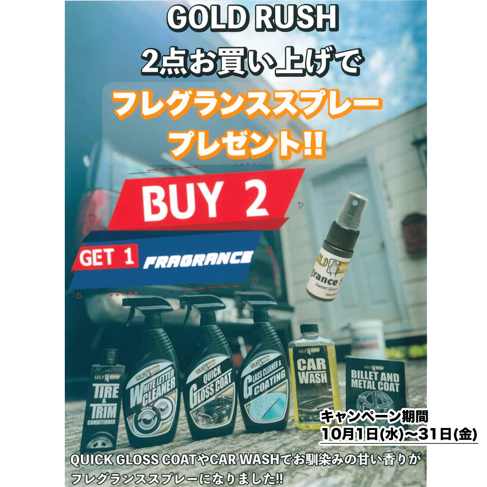 GOLD RUSH商品を2点お買い上げいただくともれなく、CAR WASH等でお馴染みの甘い香りが楽しめる『フレグランススプレー』をプレンゼント!ぜひこの機会にGOLD RUSHカーケアグッズをお試し下さい!