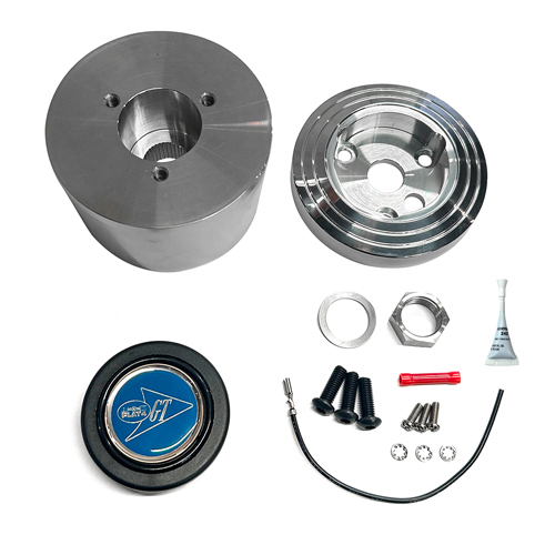 ポリッシュ仕上げのアルミビレット製ボス & トップカバー(リブ加工済み)、ステアリングナット&ワッシャー、その他ハードウェア、そしてFLAT4 GTロゴホーンボタンが付属します。