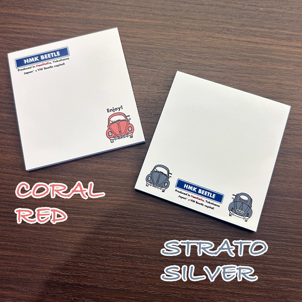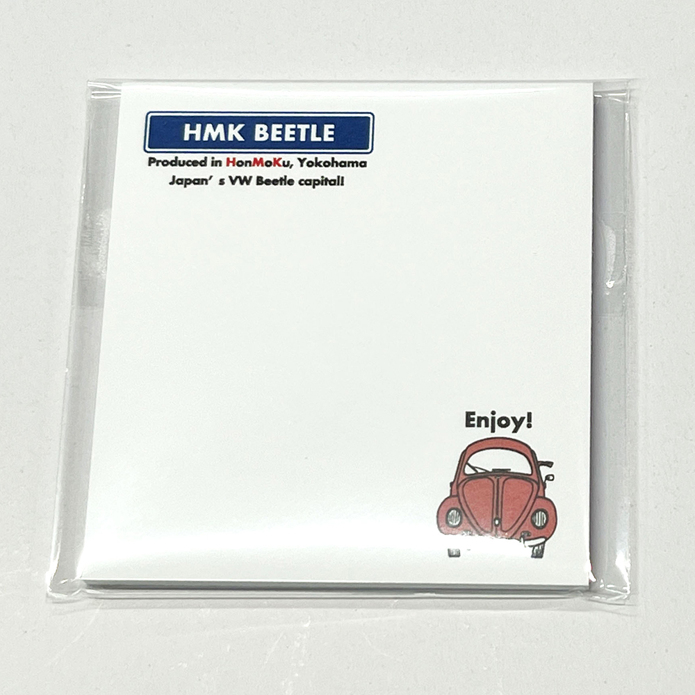 70mm x 75mmの白地ふせんに"HMK BEETLE"ロゴとL-351 コーラルレッドのTYPE-1 OVAL Window Modelのイラストが描かれた、シンプルながらもかわいらしいデザインとなります。