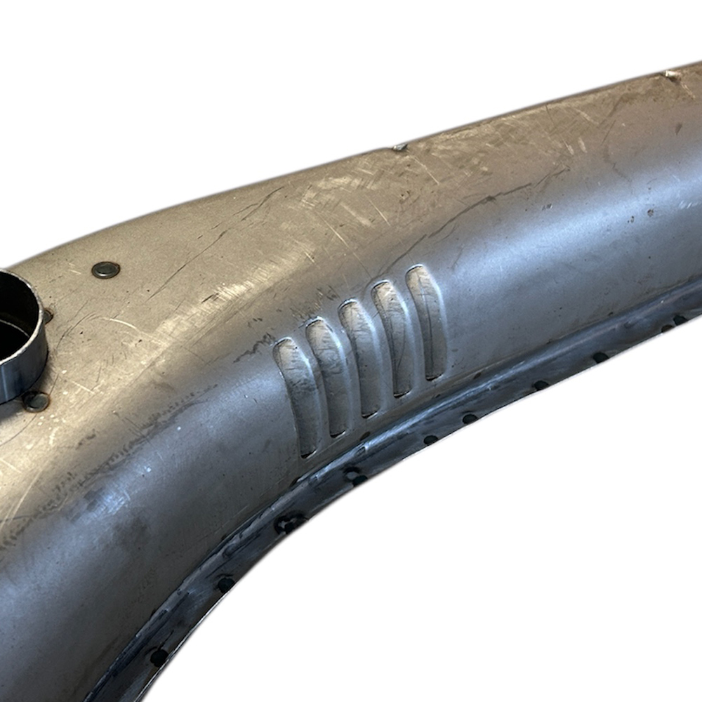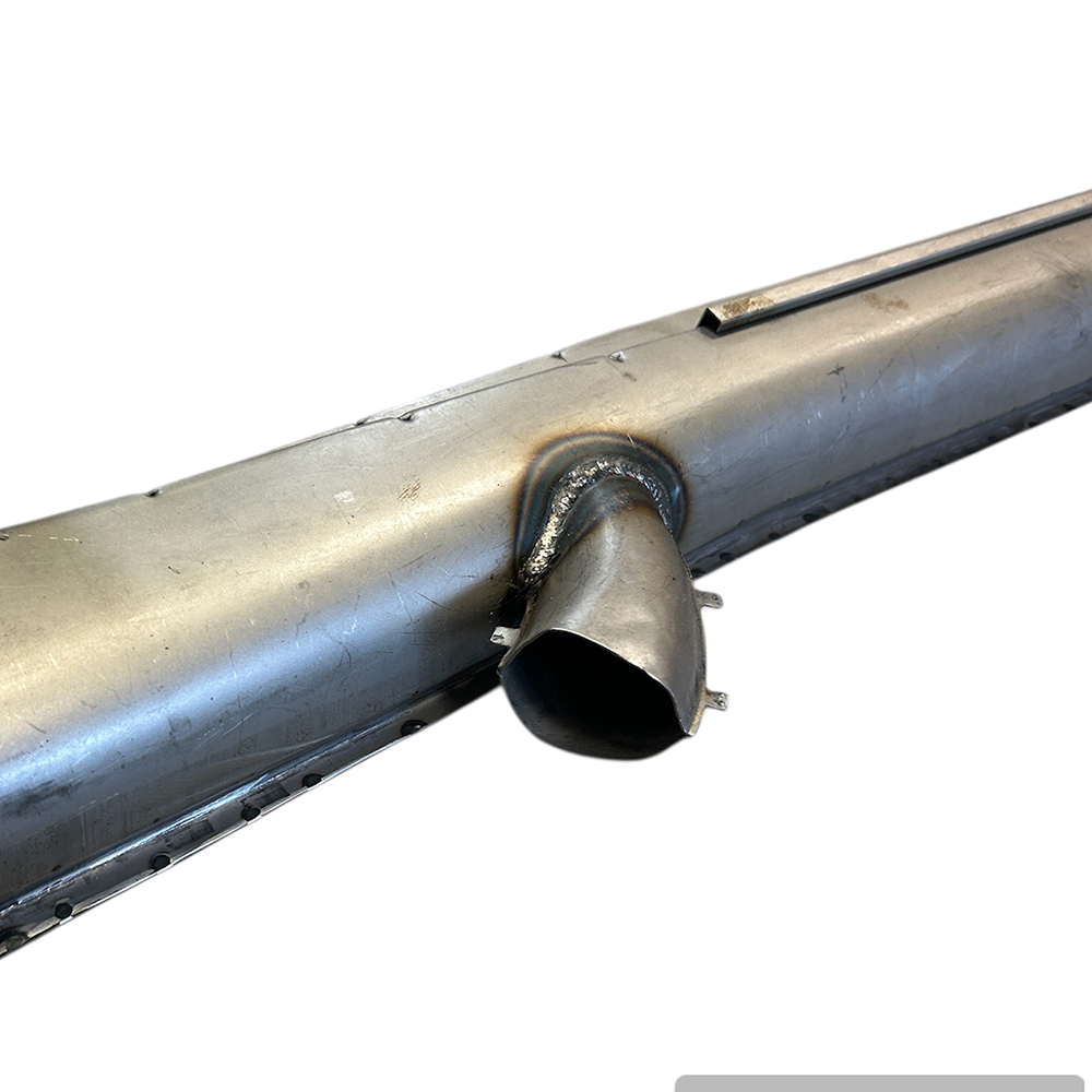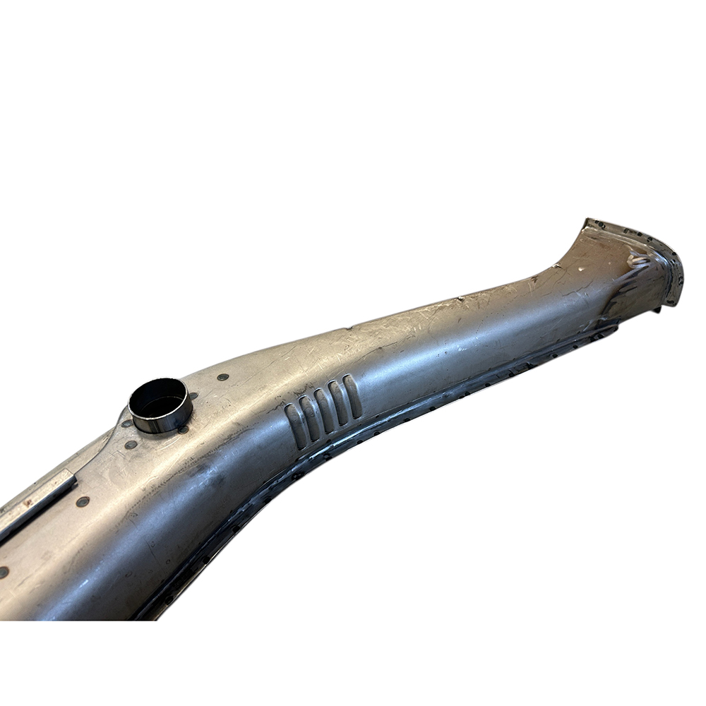 '56年12月-'59年式用はヒーターアウトレットがプレスルーバーのタイプとなり、'56年11月迄用よりも位置が後方に100mm移動。さらに、リアシート下のヒーターインレットパイプもサイドメンバーに溶接されています。デフロスターパイプは未付属となりますのでMF-115Dを別途お求めください。