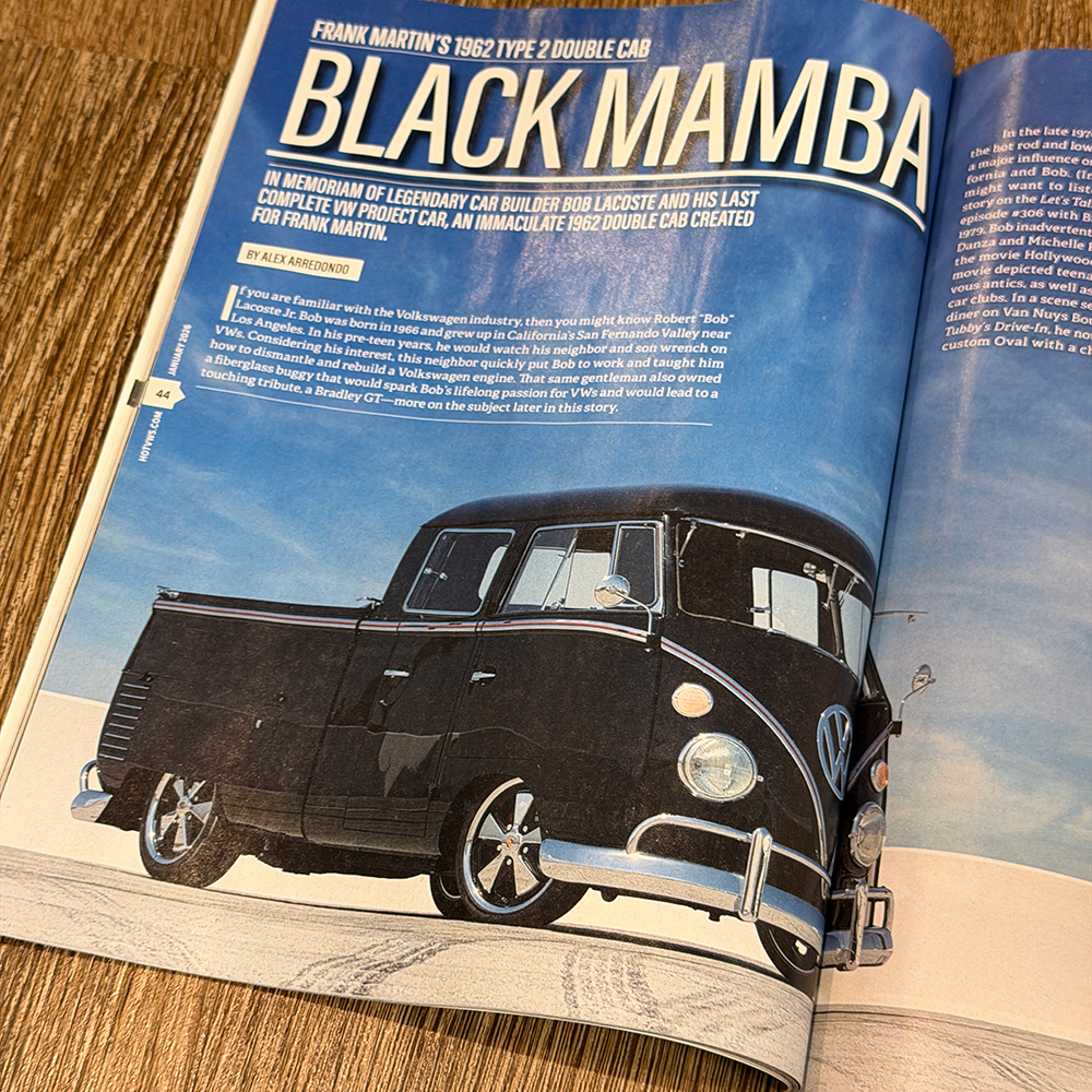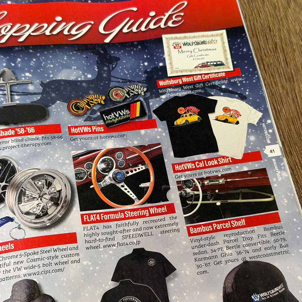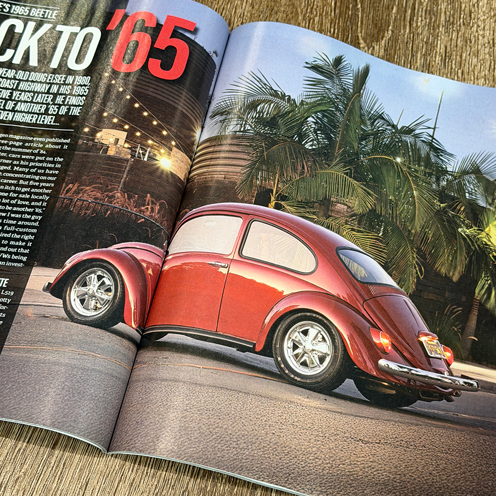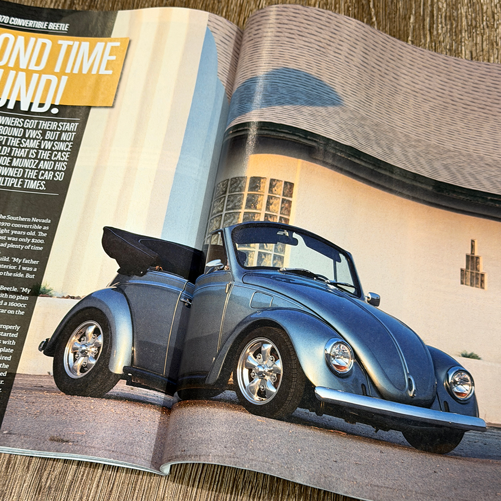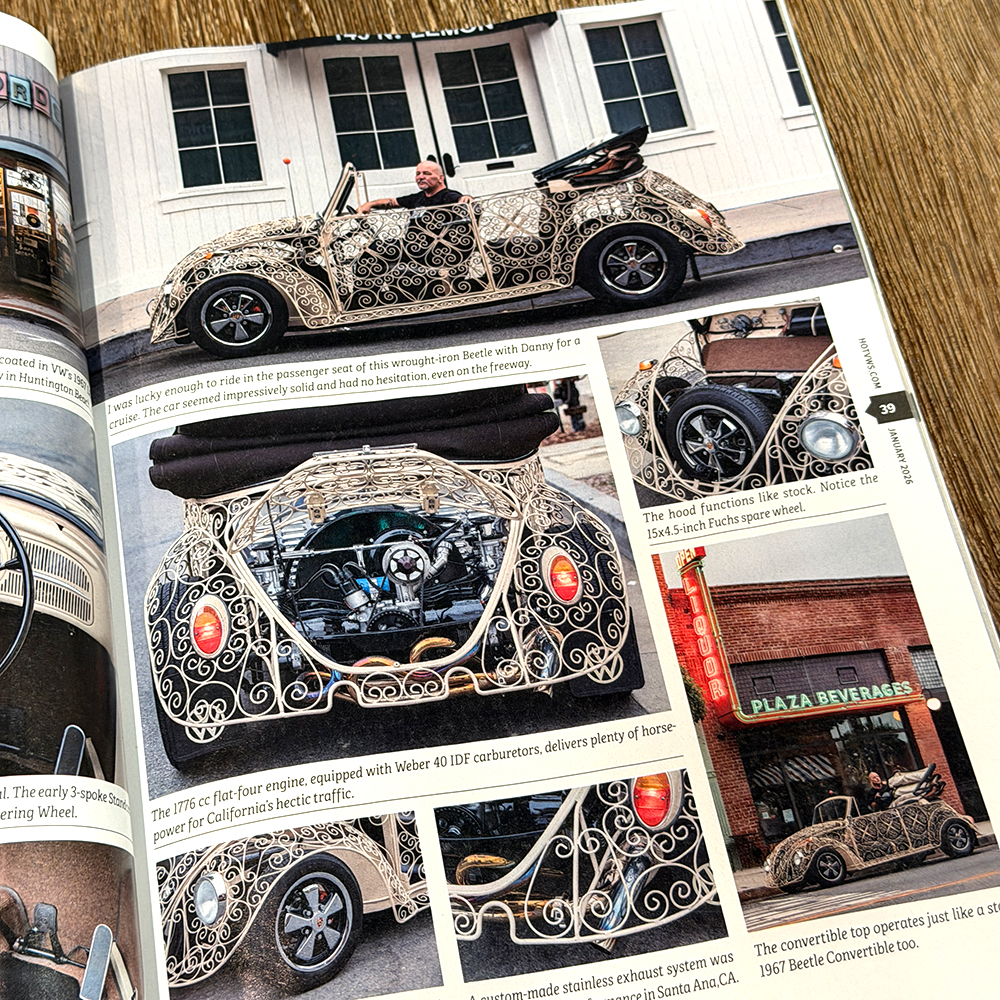 hot VWs 2026年1月号の表紙を飾る1967 TYPE-1 CONV.は、当社コレクションカーでもある"Wrought Iron"をモチーフにワイヤーメタルでボディが作られたスペシャルな1台。手作業による曲げ&溶接作業で地道に作られたボディは美しいフォルムを実現。さらにL-620サバンナベージュでのパウダーコートやR.H.D.(右ハンドル)へのコンバート等も行われています。ナンバーも掲げられておりフリーウェイでのクルーズも可能というのも驚きです。