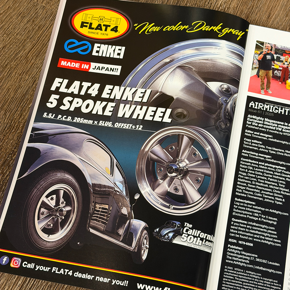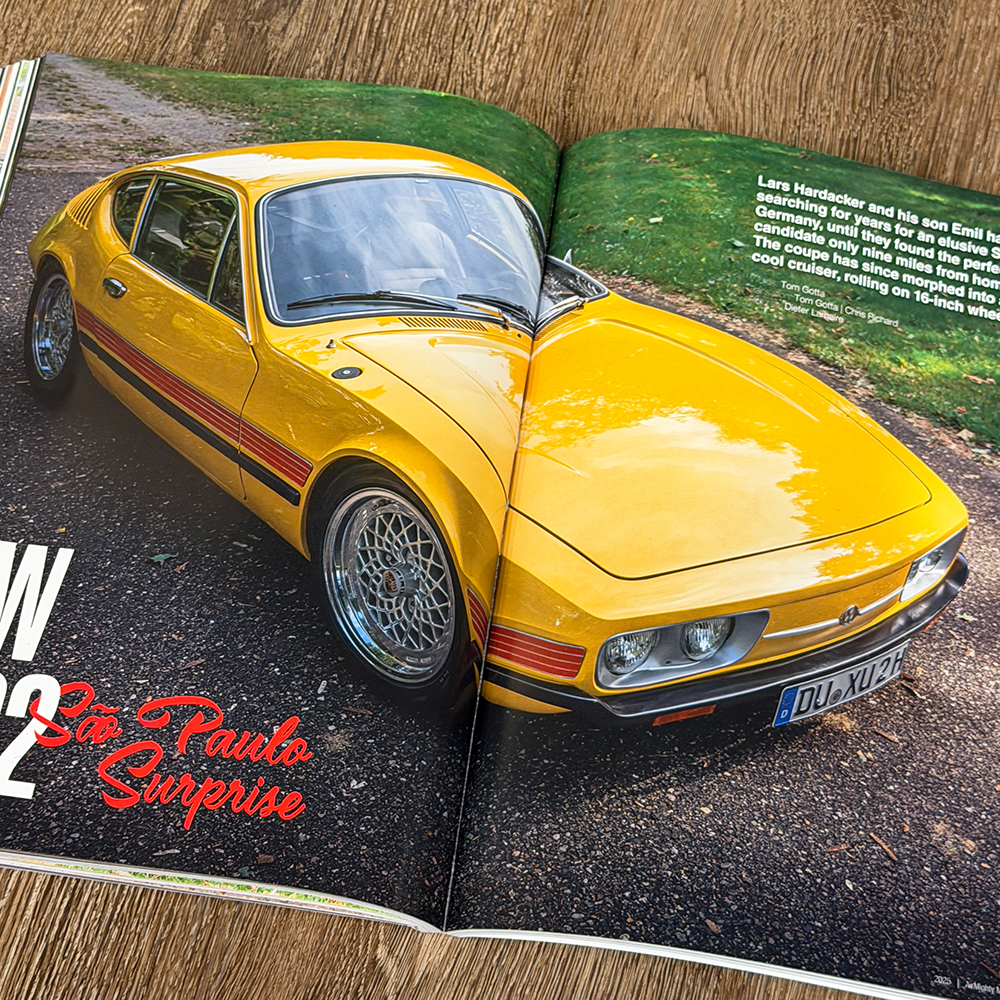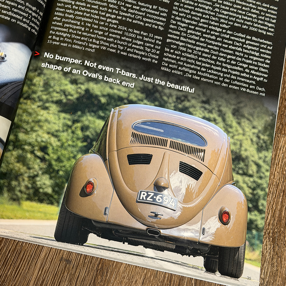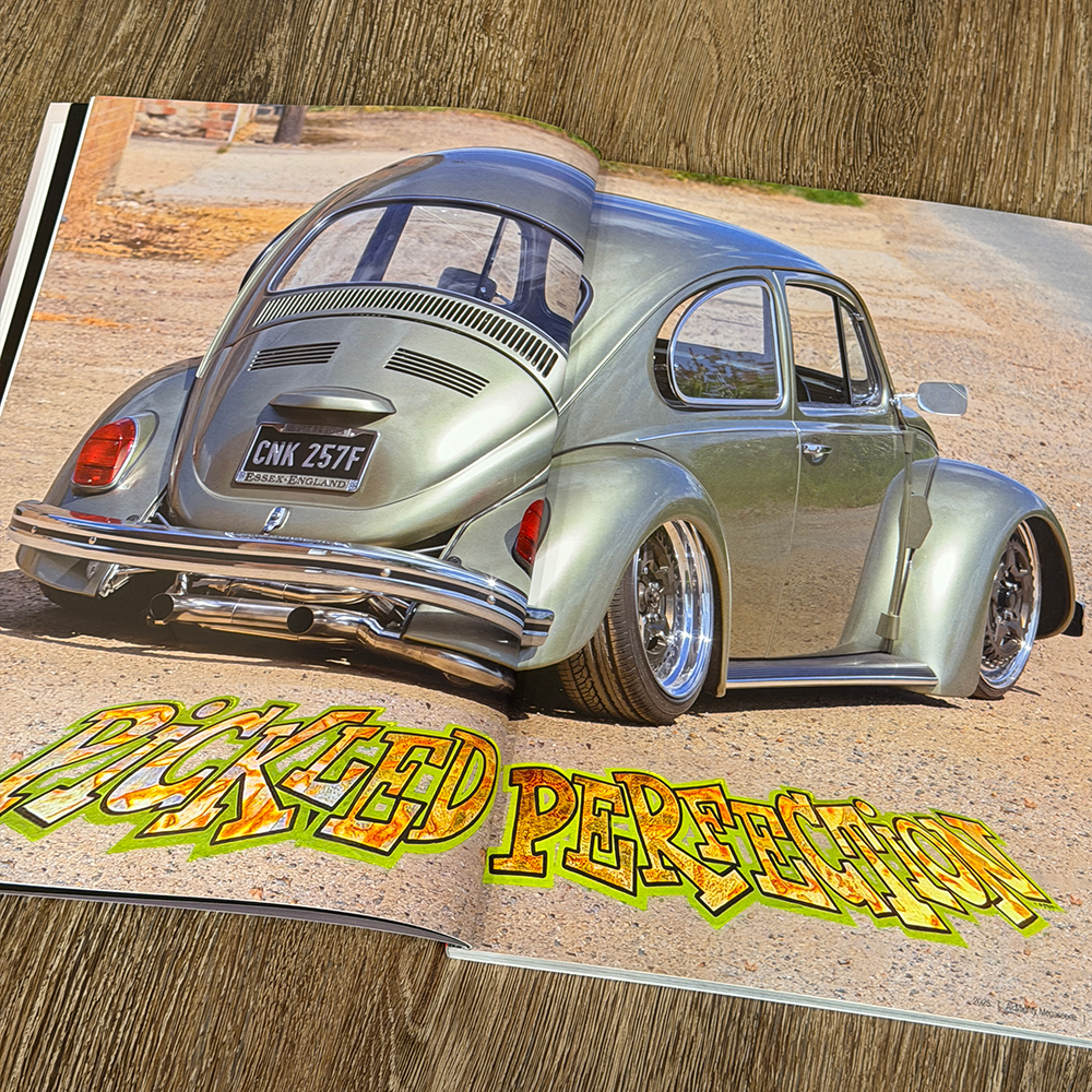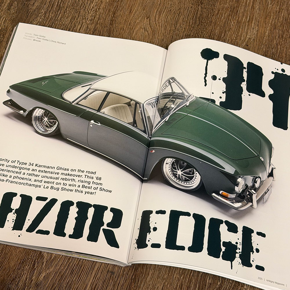 表紙を飾る1968 Type 34 Karmann Ghiaは、フランスで開催された"Le Bug Show"でBest of Showに輝いた1台。エアサスによる地を這うようなロワードスタイル、PORSCHE 356スタイルのステアリングホイール、17インチにモディファイされたRDWホイール等見所満載です。