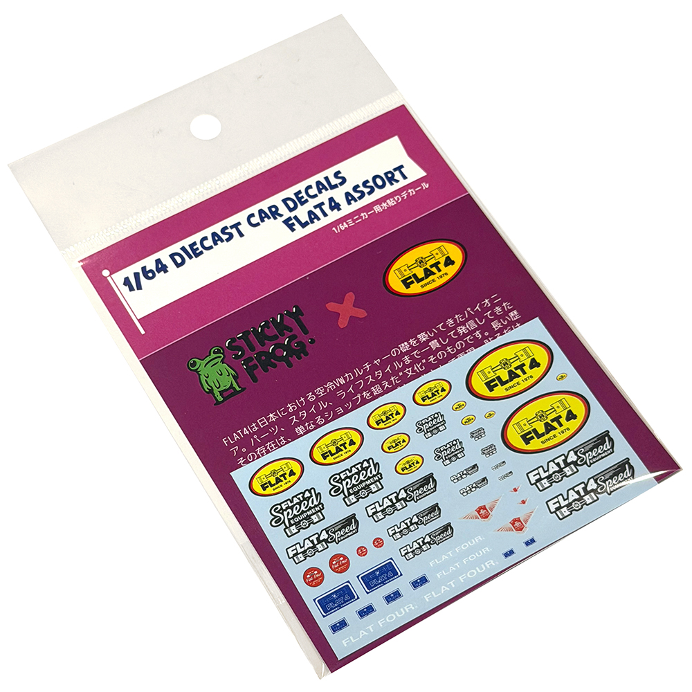 様々なミニチュアカー用デカールをリリースしている"STICKY FROG"とFLAT4がコラボレートしオリジナルで作り上げた1/64スケール ミニチュアカーデカール FLAT4アソートSETです。