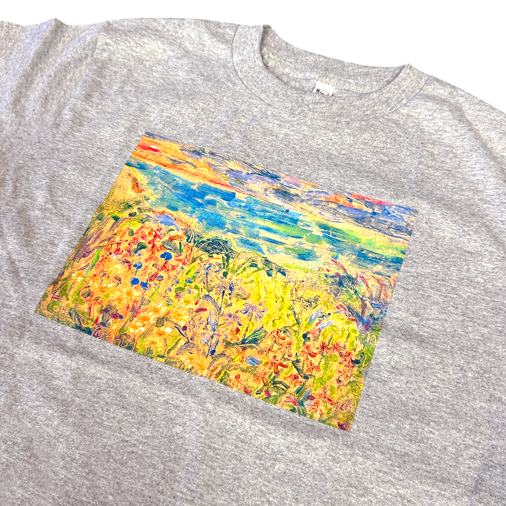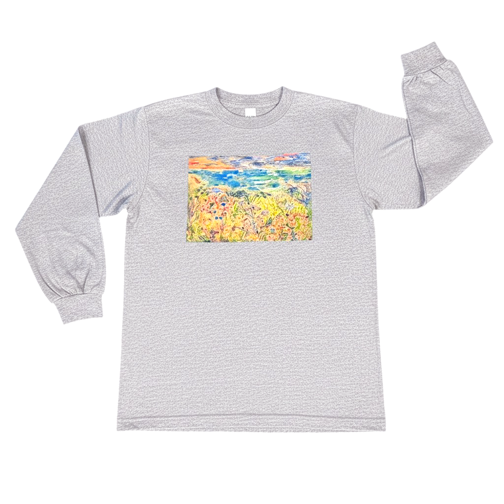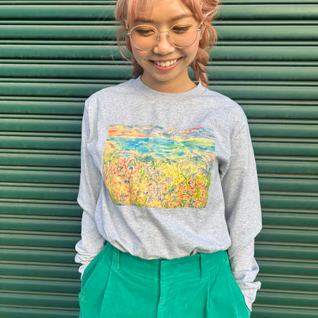 花や植物からインスピレーションを受け、仕上がりが予測できないモノタイプ技法を用いて、日常に潜む自然の美しさや揺らぎの瞬間をとらえた版画を制作するアーティスト緒方陽子氏の作品が前面にプリントされたロングスリーブ Tシャツ(グレー)です。