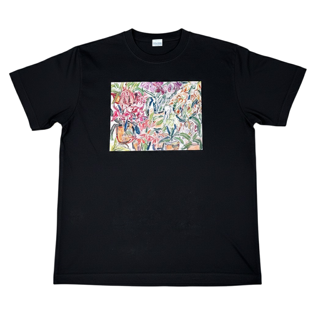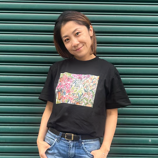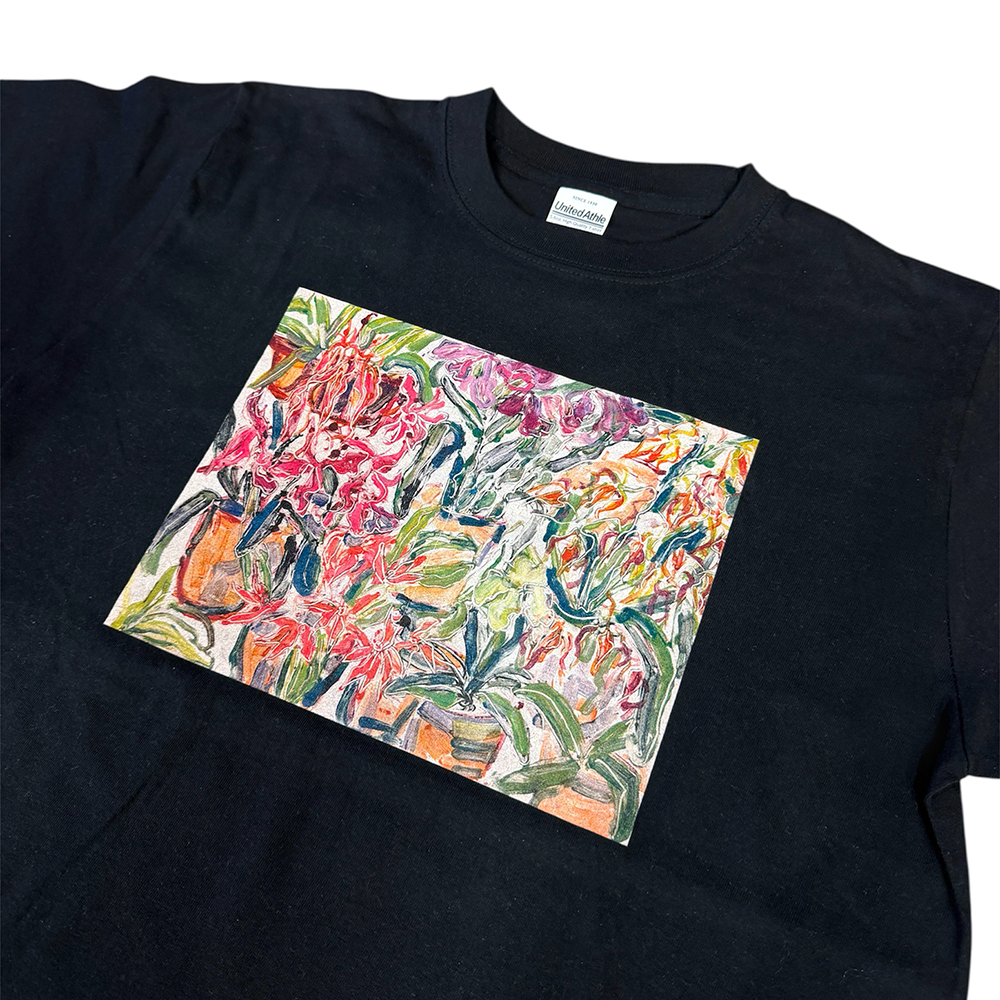 花や植物からインスピレーションを受け、仕上がりが予測できないモノタイプ技法を用いて、日常に潜む自然の美しさや揺らぎの瞬間をとらえた版画を制作するアーティスト緒方陽子氏の作品が前面にプリントされたTシャツ(ブラック)です。