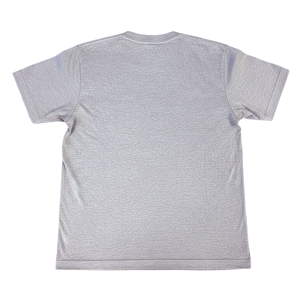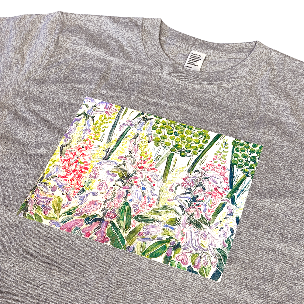 花や植物からインスピレーションを受け、仕上がりが予測できないモノタイプ技法を用いて、日常に潜む自然の美しさや揺らぎの瞬間をとらえた版画を制作するアーティスト緒方陽子氏の作品が前面にプリントされたTシャツ(グレー)です。