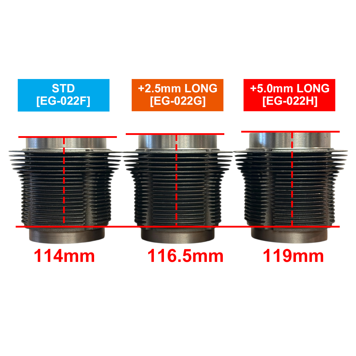 さらに、シリンダートップからエンジンケースの座面迄(シリンダーレングス)において、STD / 高さ114mm (EG-022F)に加えロングタイプとして+2.5mm / 高さ116.5mm (EG-022G)、+5mm/高さ119mm (EG-022H)もレングスをご用意しています。