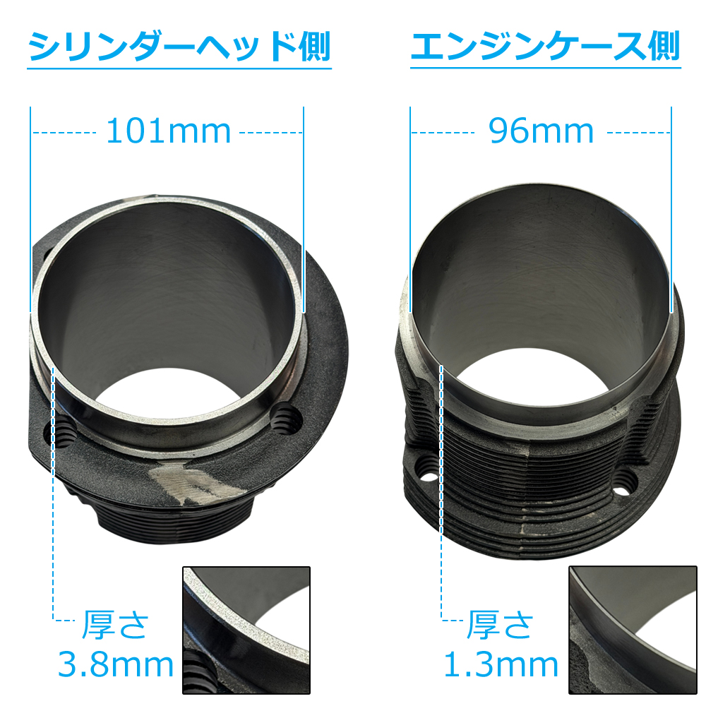 ※スリップイン=90.5/92mmサイズボアのエンジンケースに無加工で取り付け可能という意味ですので、85.5mmサイズボアなどストックのエンジンケースの場合は90.5/92mmサイズボアへのボーリング加工が必要となります。