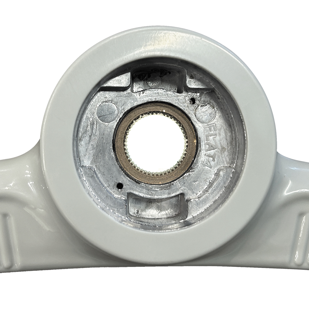 オリジナルではVDM 社製とPETRI社製がありますが、FLAT4バージョンでは造形の美しいPETRI社製デザインを採用。さらにオリジナルでは24スプラインと48スプラインが存在していましたが、タイロッドの調整後にステアリング位置の細かな微調整が行える後期の48スプラインとしました。