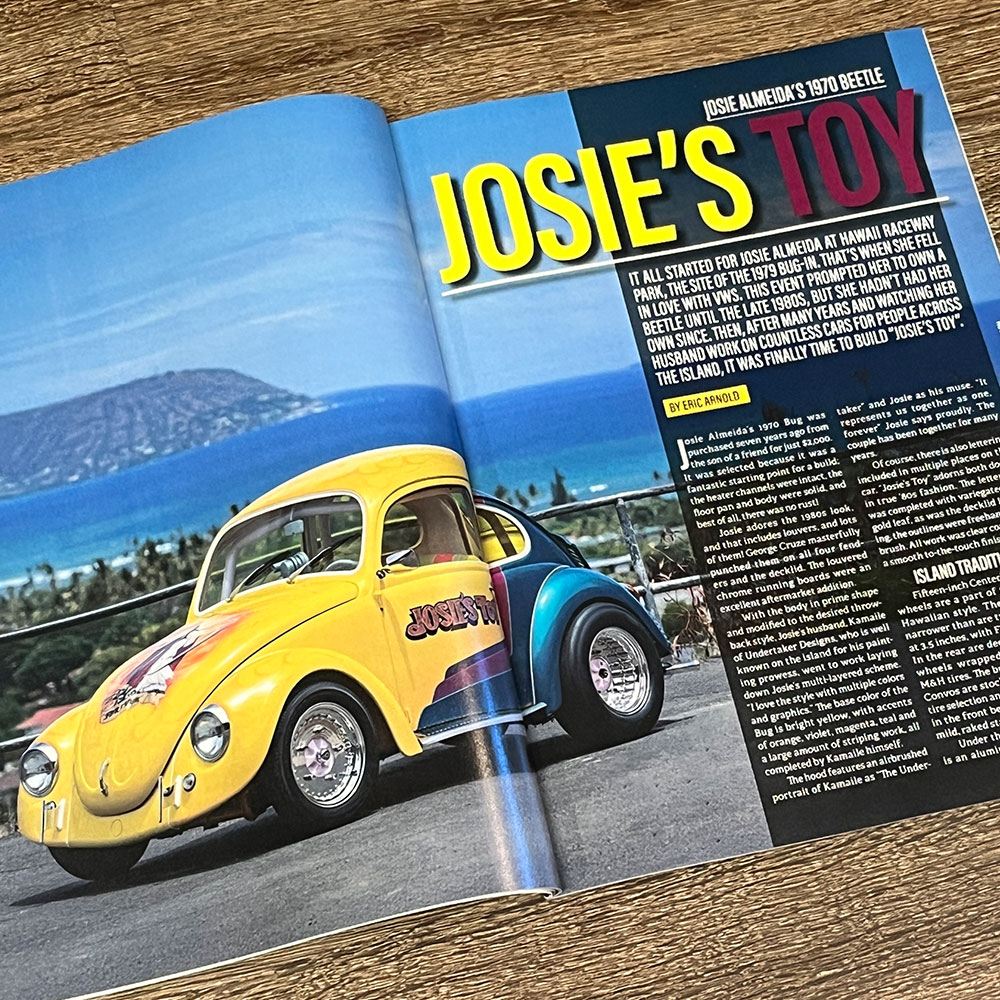 hot VWs 2026年4月号の表紙を飾る1970 TYPE-1は、往年の80'sレースカーを彷彿させる美しい仕上がりの1台で、ハワイ在住のオーナーならでは、センターラインホイールやルーバー加工されたボディパネル、クローム&ホワイトのワンポイントアクセントなど伝統的なハワイアンスタイルが取り入れたオーナーこだわりの1台です。