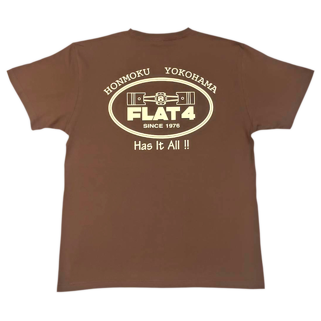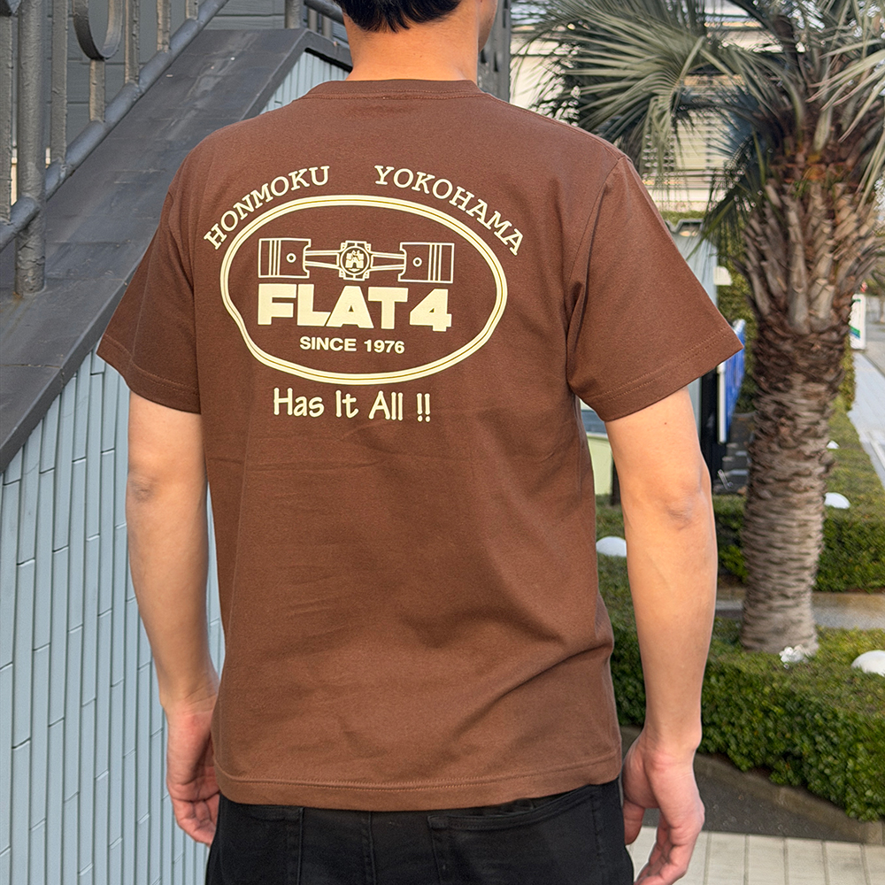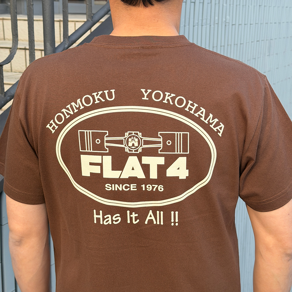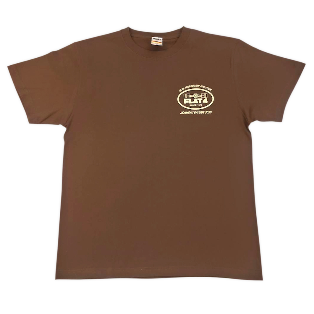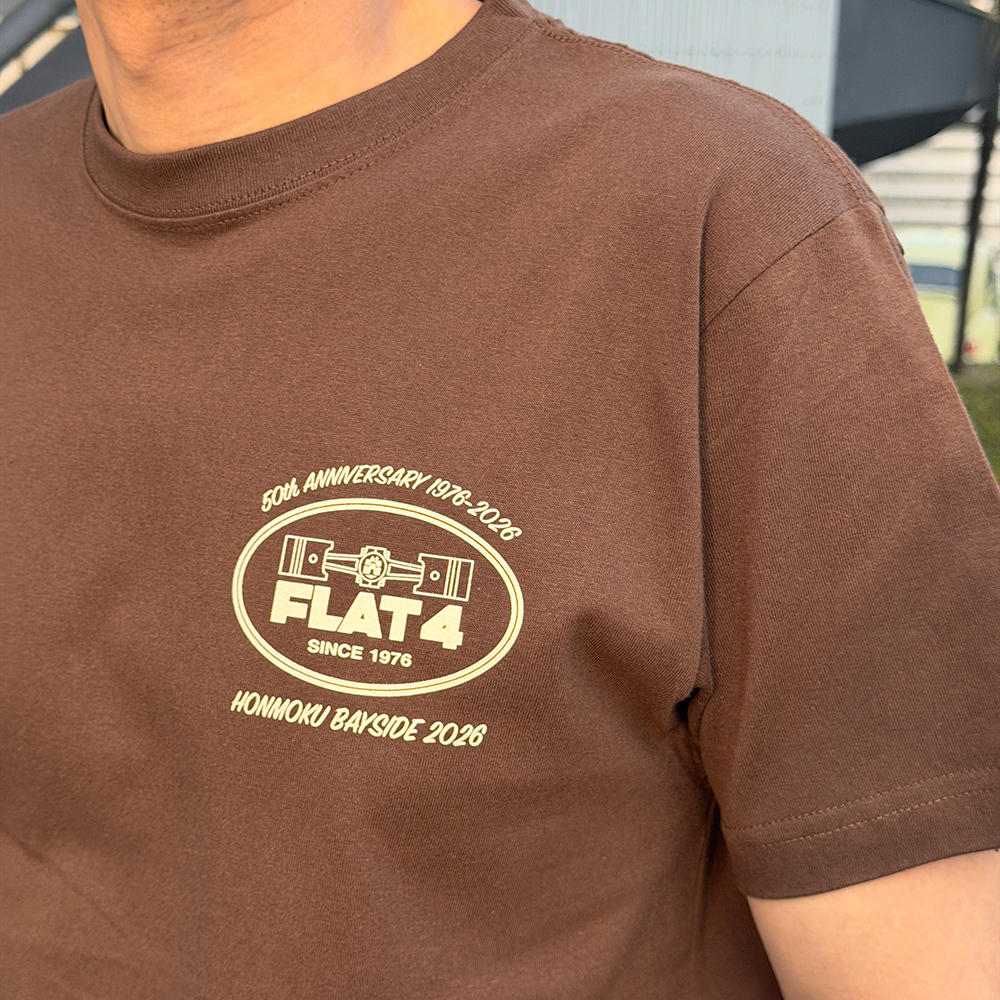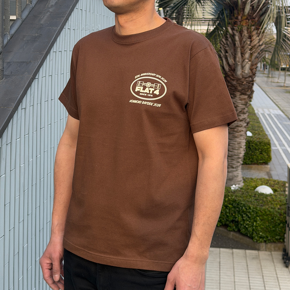 1951-54年式のTYPE-1 SPLIT/OVAL WINDOWに採用されていたVW純正カラー「L-73 チェスナットブラウン」をイメージしたTシャツに、前面胸部にはFLAT4オーバルロゴの周りに50周年を記念した"50th ANNIVERSARY 1976-2026"と本牧のSHOPである事を主張した"HONMOKU BAYSIDE 2026"のレタリングをプリント。
