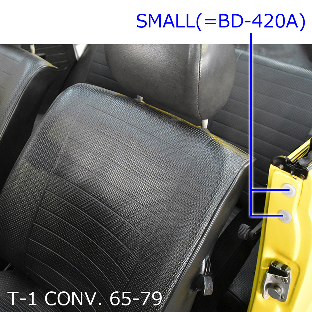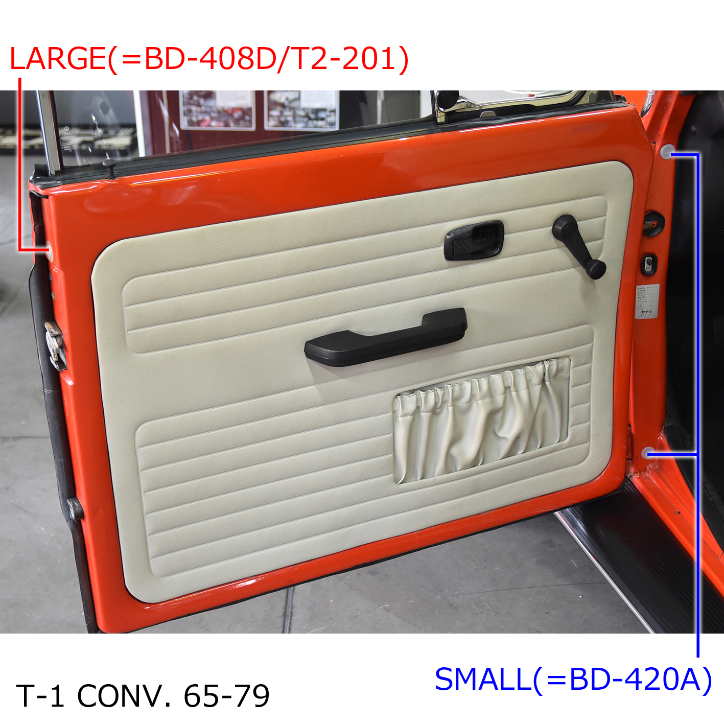 TYPE-1 CONV. '65年-'79年式のドア & ピラー用プラグSETです。φ28mm(ラージ) x2とφ25mm(スモール)x8のSETで、ラージはドアサイドのスクリュープラグ、スモールはAピラー/Bピラー各々のスクリュープラグとしてお使いいただけます。1台分の10個SETとなります。