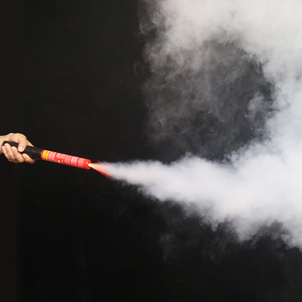 軽量かつスティック状のコンパクト設計でありながら、一定時間にわたって安定した消火成分を放出でき、粉末や液体を使用しないため、消火後の汚れが少ないことも利点です。