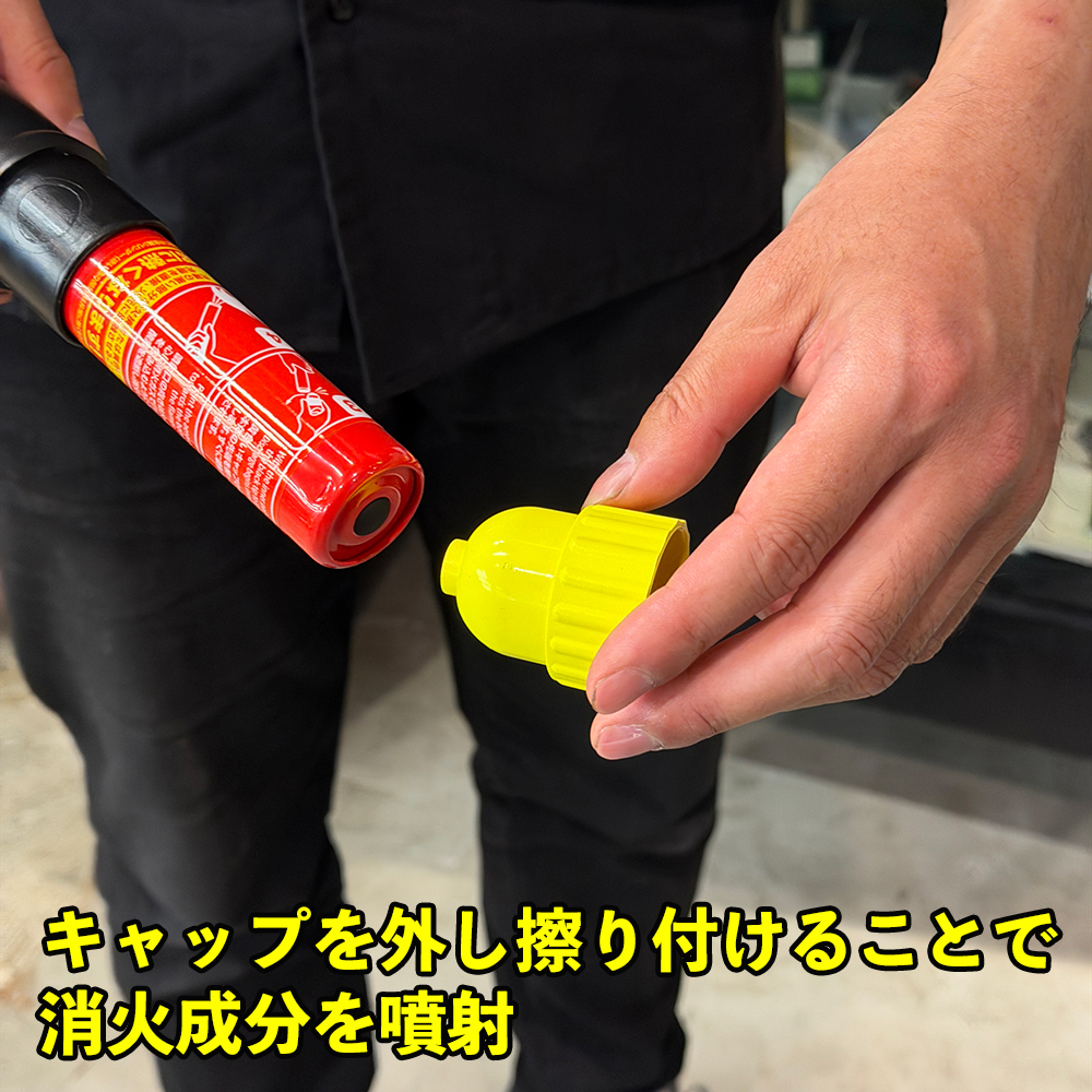 使用方法は、キャップを外し擦り付けることで消火成分を噴射し続けるというシンプルな手順です。炎そのものではなく火の根本に作用させることが重要となります。