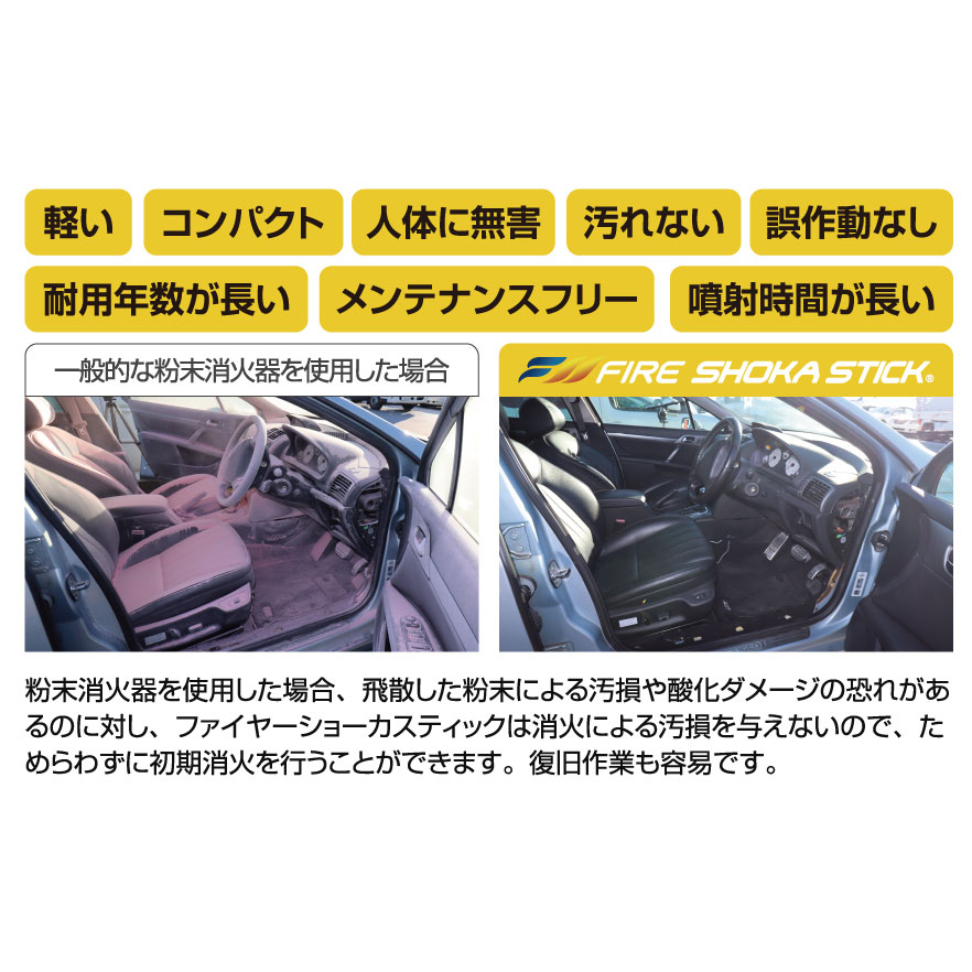 軽量かつスティック状のコンパクト設計でありながら、一定時間にわたって安定した消火成分を放出でき、粉末や液体を使用しないため、消火後の汚れが少ないことも利点です。