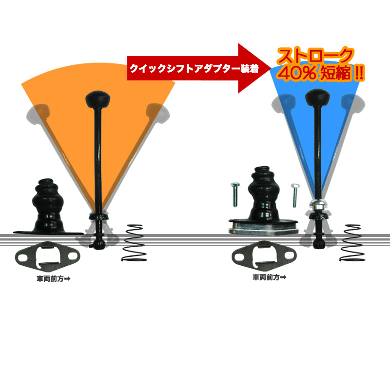 '60年代からのロングセラー、クイックシフトアダプターKITのリプロダクションで、ストックシフトレバーに取付けますと、シフトストロークを約30%短縮させ(※)、クイックなシフト感覚が得られます。