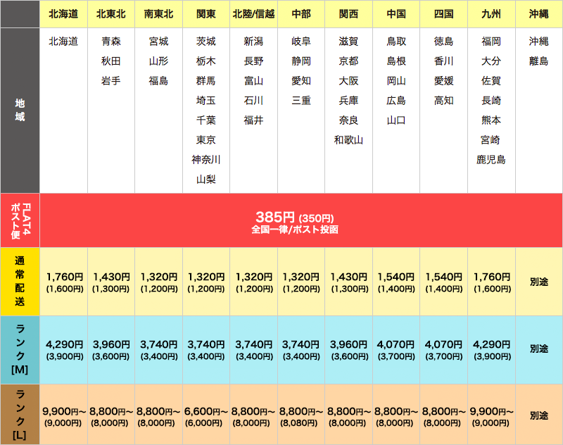 各地域において、箱サイズ160サイズ以内の商品につきましては、同一料金となります。